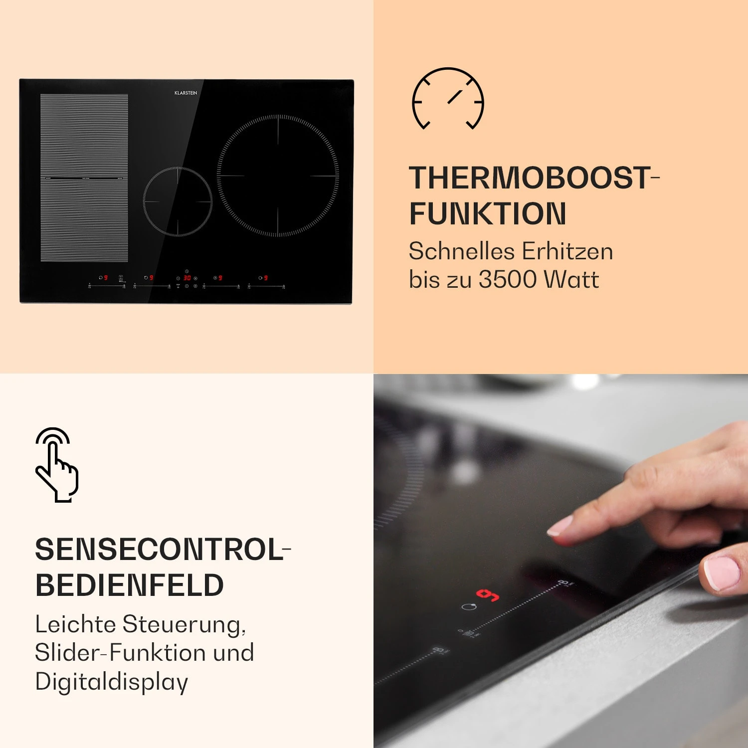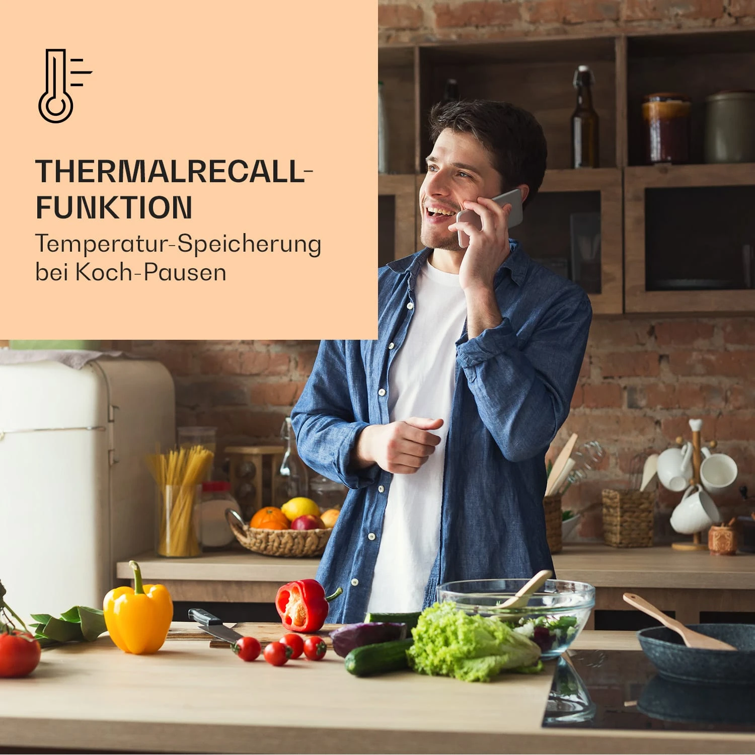 Einfach flexibler Kochen: Das Klarstein Delicatessa 77 Hybrid Induktionskochfeld erlaubt optimale Platznutzung bei minimalem Energieverbrauch. Dabei verbindet es technische Innovation mit luxuriösem Aussehen und bringt mit seiner Oberfläche aus Glaskeramik neuen Glanz in die Küchenzeile. Daneben bietet das Einbaukochfeld hohe Sicherheit: durch Überhitzungsschutz, Topferkennung, Restwärmeanzeige, Abschaltautomatik und Kindersicherung. Die VarioHeating Flexzonen-Technik ermöglicht die Verbindung von zwei Kochfeldern zu einer Kochzone.