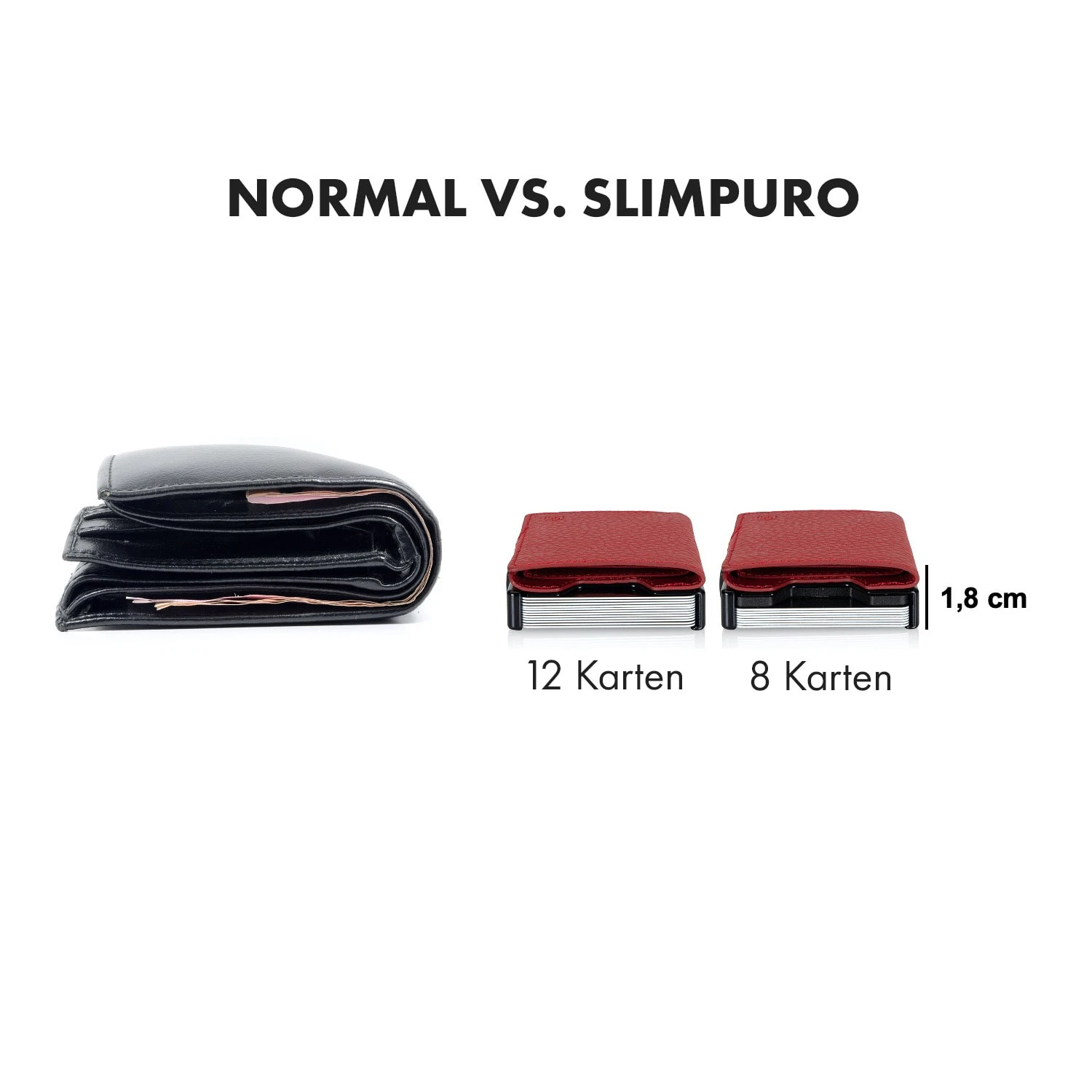 Keine Lust mehr auf große, unhandliche und unsortierte Portemonnaies? Mit dem ZNAP Slim Wallet von slimpuro schrumpft deine Geldbörse auf 8 x 1,8 x 6 cm (BxHxT) zusammen. Natürlich hast du weiterhin Platz für bis zu 12 Karten sowie Geldscheine und Münzen. Das Mini-Portemonnaie mit seinem robusten Case aus Aluminium und einer RFID Schutz Karte schützt deine Bankkarten vor Datendiebstahl. Im hochwertigen Geldscheinfach finden – ungefaltet – Banknoten bis 200 Euro Platz. Mit seinen vielen unterschiedlichen Farben und Designs findet jeder sein passendes ZNAP Slim Wallet.